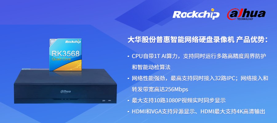 10月28日,瑞芯微電子股份有限公司(簡稱“瑞芯微”)與浙江大華技術股份有限公司(簡稱“大華股份”)聯合發布新一代安防NVR產品 – 大華股份普惠智能網絡硬盤錄像機(NVR),助力安防后端市場智能化升級。