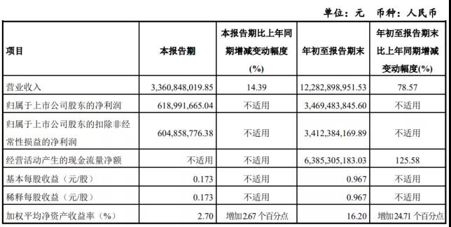 10月28日,京東方科技集團發布2021年第三季度報告,前三季度實現營業收入1632.78億元,同比增長72%;歸屬于上市公司股東的凈利潤200.15億元,同比增長708%;歸屬于上市公司股東扣非后凈利潤185.98億元,同比大增近20倍。其中,第三季度實現營業收入559.93億元,歸屬于上市公司股東凈利潤72.53億元,同比增長441%。
