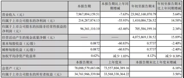 10月29日,深天馬發布三季報稱,2021年7-9月,公司實現營業收入為79.68億元,同比下降7.63%;歸屬于上市公司股東的凈利潤為2.14億元,同比下降55.93%。