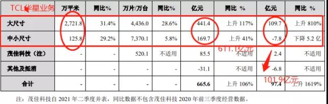 據TCL半導體業務構成表顯示,TCL 華星前三季度實現銷售面積 2,847.7 萬平方米,同比增長 31.3%,實現營業收入611.1億元,同比增長79%,凈利潤101.9億元。其中,大尺寸出貨面積2721.8萬平方米,同比增長31.4%;實現營收441.4億元,同比增長117%,凈利潤109.7億元,同年增長810%;而中小尺寸出貨面積為125.8萬平米,同比增長29.2%,實現營收169.7億元,同比增長41%,凈利潤虧損7.8億元,同比下降5.2億元。
