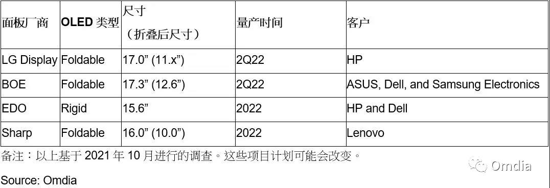 表1: 其他面板廠商對OLED筆記本面板的2022年計劃