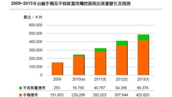 DIGITIMES Research分析師楊仁杰分析,2010年臺灣廠商手機用觸控模塊出貨量達2.3億片,較2009年的1.5億片成長51%,由于國際大廠功能型手機(feature phone)也將采用觸控面板,預估2013年將再成長至4.2億片。