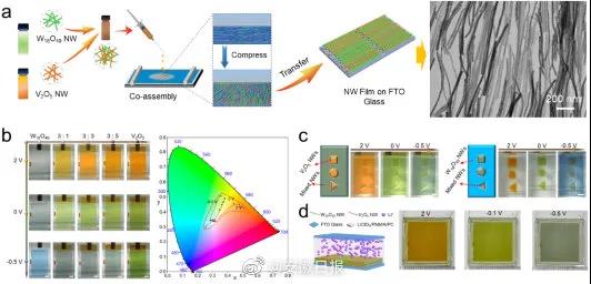 俞書宏院士團隊研制出一種基于納米線組裝體的多色顯示電致變色器件,通過采用界面組裝技術將氧化鎢和氧化釩納米線組裝在一起,從而使器件具有特定的光學、電學和多色顯示特性。在施加不同電壓下,組裝體可以呈現出由橙色、綠色到灰色的動態顏色變化。通過控制兩種納米線的比例,還可調控組裝薄膜的顏色顯示、透明度、響應時間、著色率等電致變色性能。此外,在掩膜板輔助下,界面組裝技術通過構造各種圖案和調控組分,可以實現更復雜的色彩顯示和信息傳輸。
