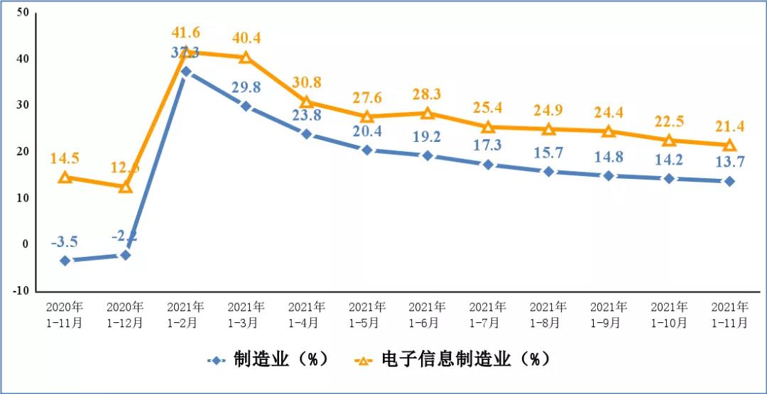 IT之家12月31日消息,今日工信部發(fā)布了2021年1月—11月份電子信息制造業(yè)運(yùn)行情況。報(bào)告顯示,11月份,規(guī)模以上電子信息制造業(yè)增加值同比增長13.5%,增速比上年同期提高4.2個(gè)百分點(diǎn)。
