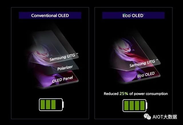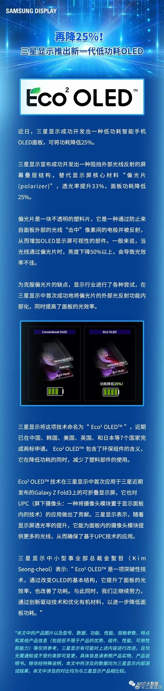 圖片來(lái)源(global.samsungdisplay.com)三星顯示研發(fā)的“Eco2 OLED™”技術(shù)采用疊層結(jié)構(gòu)代替?zhèn)鹘y(tǒng)核心材料偏光片,將OLED面板的透光率提升33%,功耗降低25%,首次應(yīng)用于三星旗下折疊屏智能手機(jī)Galaxy Z Fold3。由于該技術(shù)去除偏光片,被視為環(huán)境友好型技術(shù)。Eco2 OLED 技術(shù)首次應(yīng)用于去年8月份發(fā)布的三星 Galaxy Z Fold3 上的可折疊顯示屏,它也對(duì) UPC(屏下攝像頭)的應(yīng)用做出了貢獻(xiàn)。三星顯示表示,隨著顯示屏透光率的提升,它能為面板內(nèi)的攝像頭模塊提供更多的光線,從而確保了基于 UPC 技術(shù)的應(yīng)用。