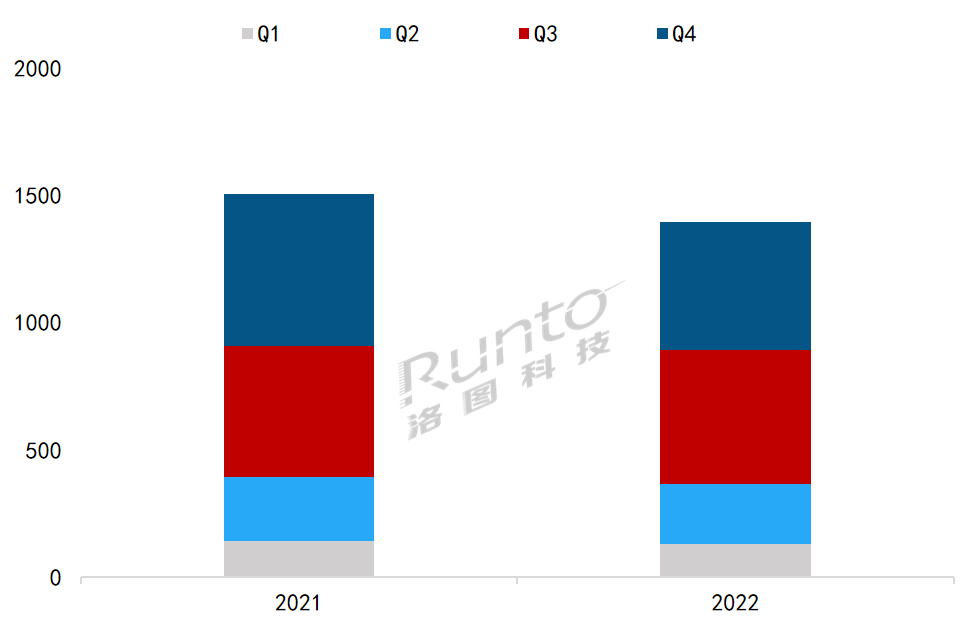 分季度表現(xiàn)來看,上半年下滑6.7%,第三季度市場回暖;第四季度進入新冠感染高峰期,封城、臨時停業(yè)等行為導致市場銷售活動受到影響,當季出貨50.1萬臺,下滑幅度最大,達-16.4%。