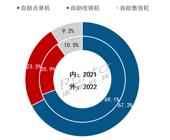 本文主要聚焦于消費零售類產(chǎn)品,包含自助點單機、自助收銀機、自助售貨機。根據(jù)洛圖科技(RUNTO)數(shù)據(jù)顯示,2022年,自助點單機出貨量占比67.3%,自助售貨機占比9.2%;自助收銀機占比23.5%,是絕對出貨量和內(nèi)部份額唯一增長的品類,在整體自助設備的占比中增長了2.6個百分點。