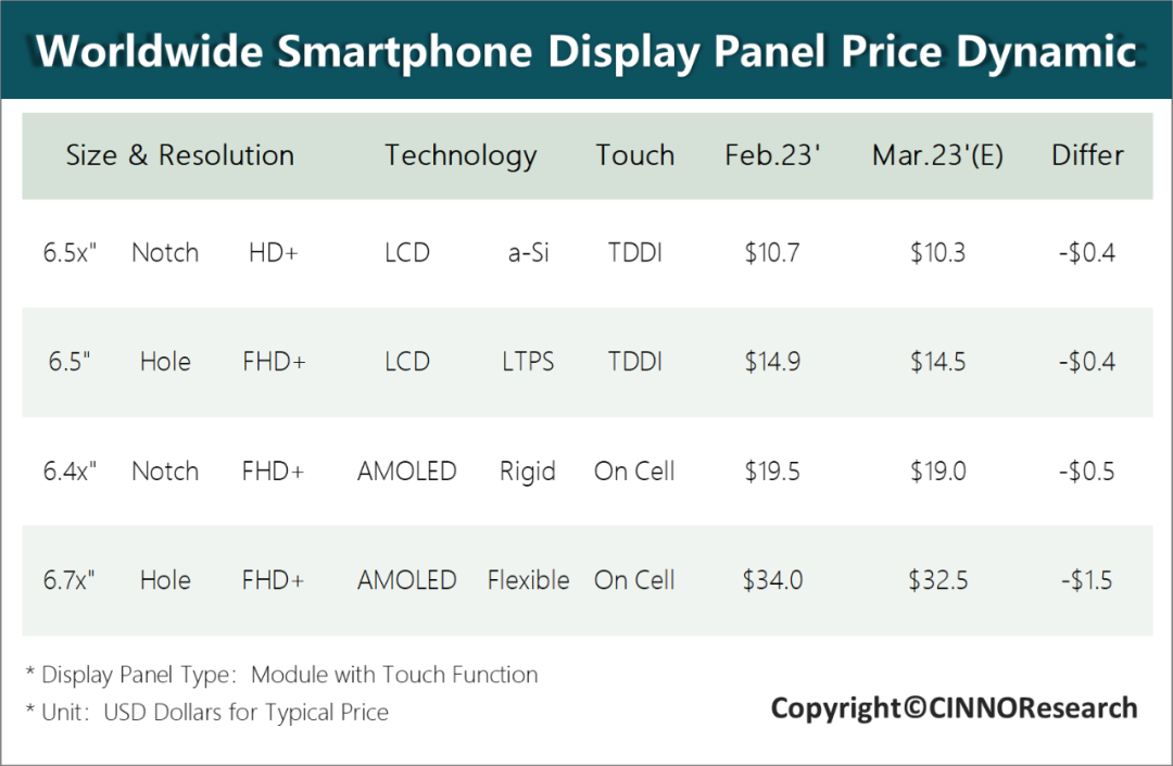 CINNO Research預(yù)測,短期內(nèi)手機(jī)面板價格依然處于下行周期,2023年3月和4月a-Si/LTPS面板價格將每月下降0.4美金;剛性AMOLED面板價格將繼續(xù)下降0.5美金;柔性AMOLED面板價格或?qū)⑾陆?.5美金,但隨著需求的持續(xù)向好,LCD手機(jī)面板價格或?qū)⒃诘诙径饶┯|底反彈,AMOLED面板價格的止跌或?qū)⒙浜笠粋€季度。