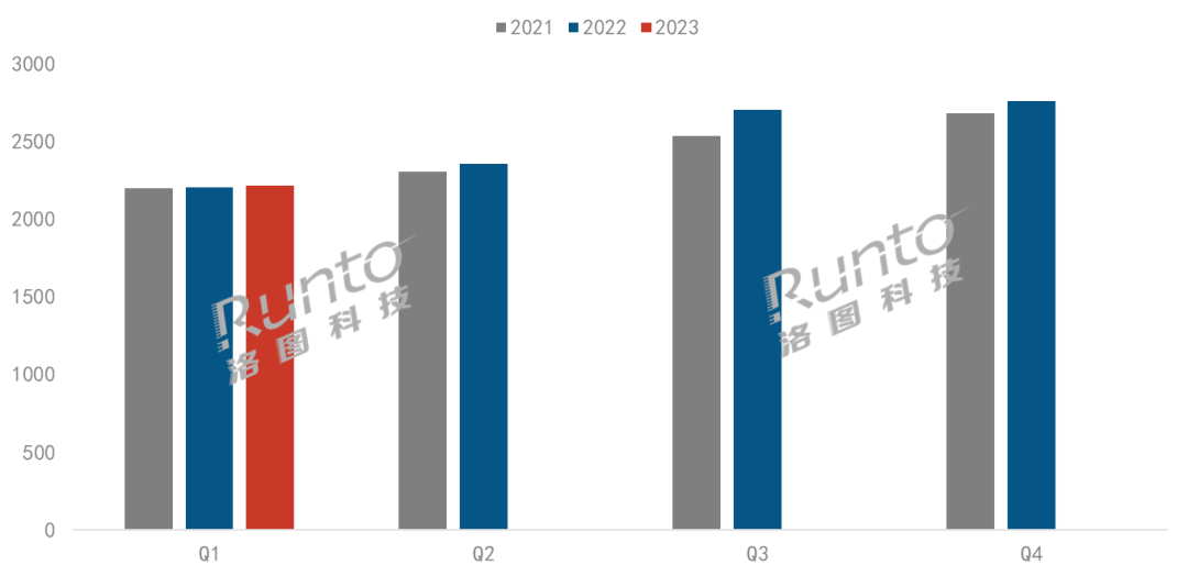 根據(jù)洛圖科技(RUNTO)發(fā)布的《全球電視代工市場(chǎng)出貨月度追蹤》報(bào)告,2023年第一季度,全球電視代工市場(chǎng)整體(含長(zhǎng)虹、康佳、創(chuàng)維、海信四家自有工廠)出貨總量為2219萬(wàn)臺(tái),較2022年同期微增0.6%。2021-2023年 全球電視代工市場(chǎng)季度出貨量變化
