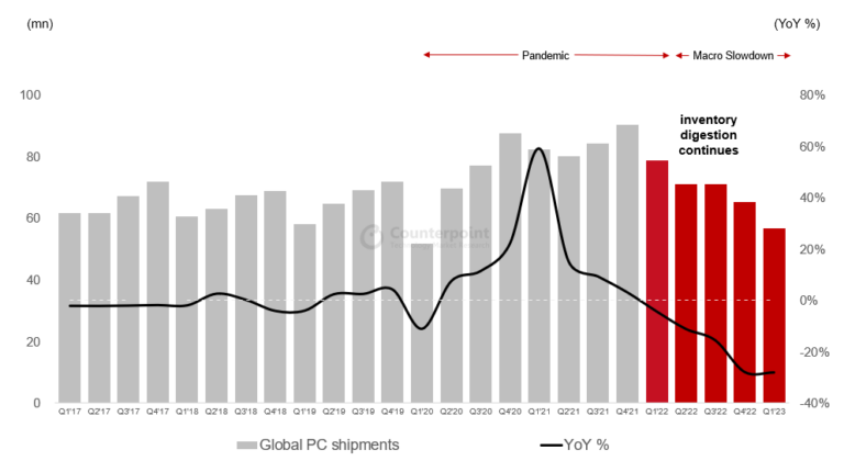 4 月 18 日消息,根據(jù)市場(chǎng)調(diào)查機(jī)構(gòu) Counterpoint Research 公布的最新報(bào)告,2023 年第 1 季度全球個(gè)人電腦出貨量為 5670 萬(wàn)臺(tái),同比下降了 28%。這也是過去 10 年來第 1 季度出貨量最低的年份。
