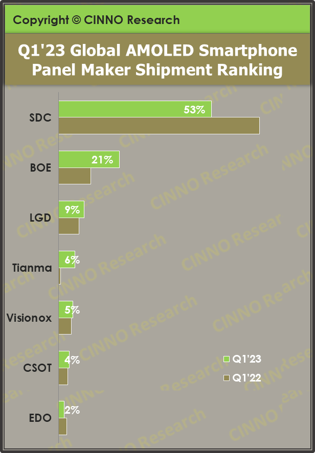 三星顯示(SDC)AMOLED智能手機面板出貨量約0.7億片,同比下滑32.7%,市場份額由去年同期的70.2%縮窄至53.3%,份額下降近兩成,主要因國內柔性AMOLED面板廠持續以激進的價格搶占訂單,三星剛性和柔性面板的需求都遭受較大沖擊,尤其在中國市場出貨量銳減;