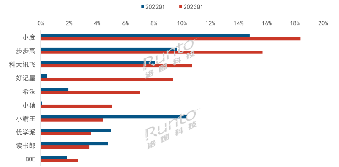 針對學(xué)習(xí)本的品牌格局來看,TOP6品牌的小度、步步高、科大訊飛、好記星、希沃、小猿的市場份額在第一季度均出現(xiàn)了顯著增長。
