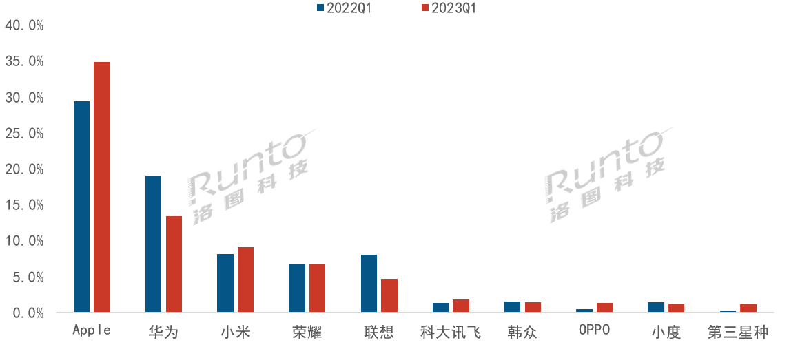 蘋果、華為、小米穩(wěn)定在前三名,合計份額達(dá)57.4%。蘋果一季度份額達(dá)到34.9%,比去年同期增長了5.4個百分點(diǎn),主要源于其在二三月份開學(xué)季推出了教育優(yōu)惠政策和返校促銷降價。