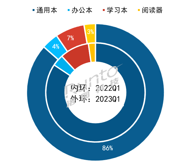 根據(jù)洛圖科技(RUNTO)線上監(jiān)測數(shù)據(jù)顯示,2023年第一季度,通用本仍為市場主流,銷量占比為86.5%,較去年同期增加了2.1個百分點(diǎn)。學(xué)習(xí)本占比為6.8%,較去年同期減少了2.8個百分點(diǎn);閱讀器(注:Kindle不屬于智能平板)和辦公本占比分別達(dá)到4.0%和2.7%。