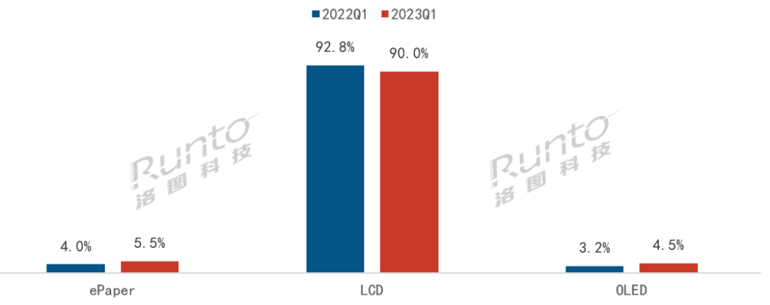根據(jù)洛圖科技(RUNTO)線上監(jiān)測數(shù)據(jù)顯示,2023年第一季度,智能平板屏幕類型以LCD(液晶顯示)為主,占比達(dá)到90%,較去年同期下降2.8個百分點(diǎn);ePaper(電子紙)和OLED作為新興技術(shù)正在成長中,份額分別上漲1.5和1.3個百分點(diǎn)。合并占到約10%。