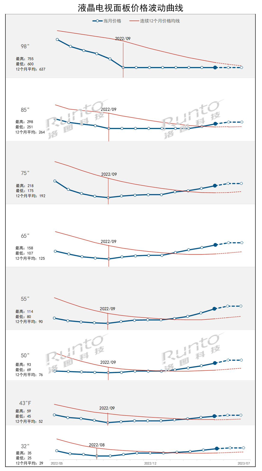 5月21日,洛圖科技發布了2023年6月液晶電視面板的價格趨勢。數據顯示,全球液晶電視面板價格在5月持續上漲,不過并未如期收斂。各尺寸電視的均價持續攀升,85寸電視均價上漲20美元,65和75寸電視均價分別上漲10美元,50和55寸電視分別上漲7和10美元,32和43寸電視分別上漲2-3美元。面板廠商的經營情況和控盤邏輯是影響面板價格的重要因素。