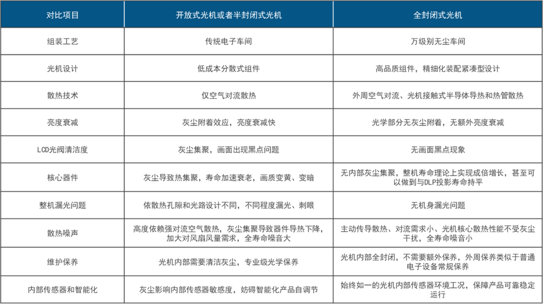 全封閉式光機是1LCD投影發(fā)展過程中極其關(guān)鍵的技術(shù)進步。相比傳統(tǒng)全開放式、半開放式光機,全封閉式光機解決了壽命、可靠性以及顯示性能等方面的劣勢。