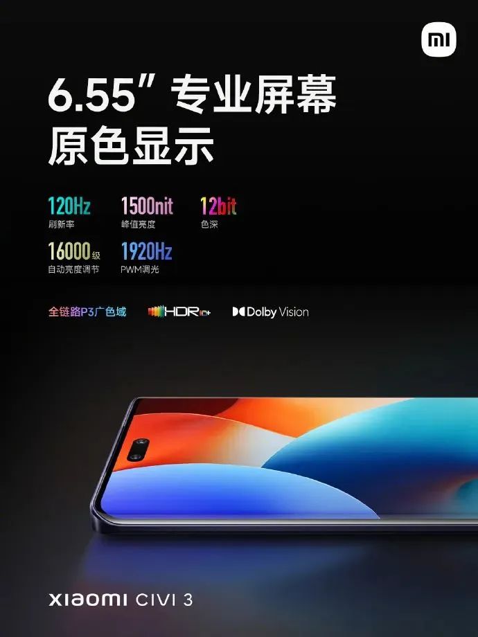 5月25日,小米正式發(fā)布了小米 Civi 3 手機,小米 Civi 3 采用6.55英寸 2400×1080 OLED 雙曲屏,支持 120Hz 刷新率、240Hz 觸控采樣率,使用華星光電 C6 發(fā)光材料,全局亮度 1200nit,峰值亮度 1500nit,支持超動態(tài)顯示,通過了杜比視界、HDR10+ 認證,12bit 色深、1920Hz 高頻 PWM 調光,JNCD≈0.41、deltaE≈0.50,采用康寧 GG5 保護玻璃。