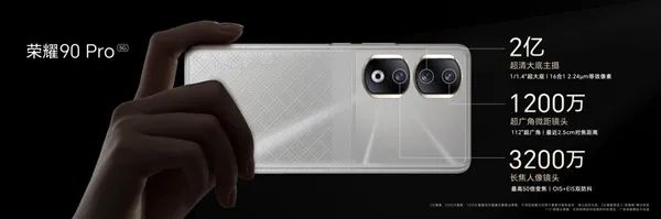影像上,榮耀90 Pro后置2億像素超清主攝,傳感器尺寸是1/1.4英寸,支持16合1,等效像素2.24微米,同時配備一顆1200萬像素超廣角微距鏡頭和一顆3200萬像素長焦人像鏡頭。