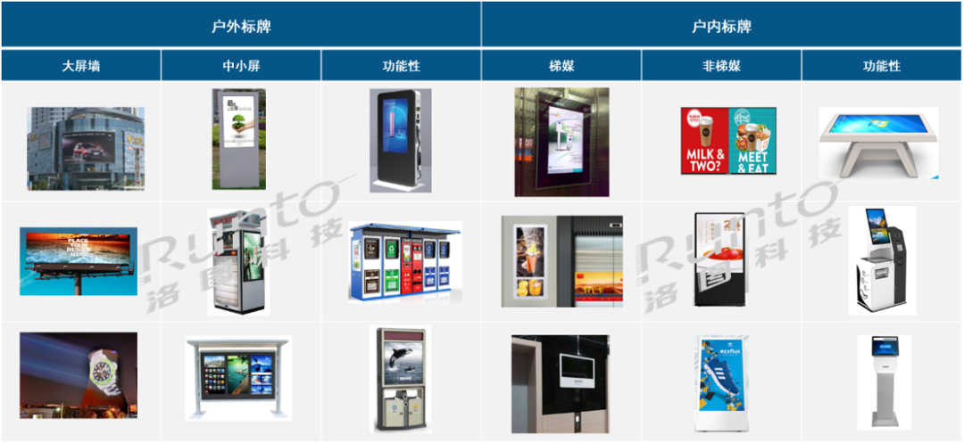 數字標牌市場分為戶外和戶內產品。戶外產品包括戶外墻/大屏(如LED屏、投影墻、拼接墻等設備)、戶外顯示中小屏(如落地產品、電子站牌、閱報欄等產品),以及功能性自助設備(如智能充電樁、快遞柜、智慧垃圾桶等)。戶內產品多指梯媒顯示、非梯媒的壁掛式、立式、臥式等顯示產品、以及功能性自助設備(如繳費機、互動營銷桌、導覽查詢等自助設備)。