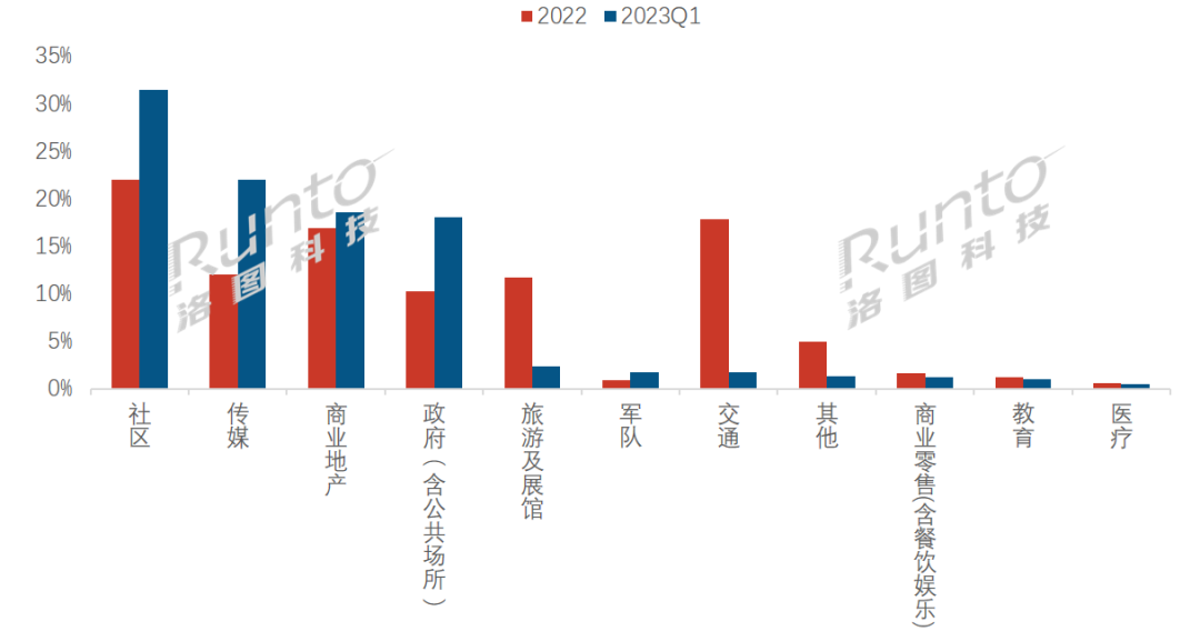 從細分應用行業來看,傳媒仍是戶內數字標牌市場中占比最高的應用行業,達到32.3%。商業零售盡管業績加速恢復,但費用支出的節奏遠不如收入,反映了疫情期間飽受磨難之后的行業心態變化,該領域的數字標牌出貨占比達到12.7%。另外,隨著國家大力發展文化產業,政府(含公共場所)的占比有所上升,達到12.5%。整體戶內市場中,下降幅度最大的是企業領域。今年第一季度,企業利潤未見好轉,以規模以上工業企業為例,利潤下降21.4%。因此,企業在支出和投資方面偏向保守,占比與2022年相比下降了7.7個百分點,僅剩10.4%。和戶外一樣,戶內產品受益于智慧社區的投入,市場占比的增長幅度最大,與2022年相比增長了4.0個百分點。