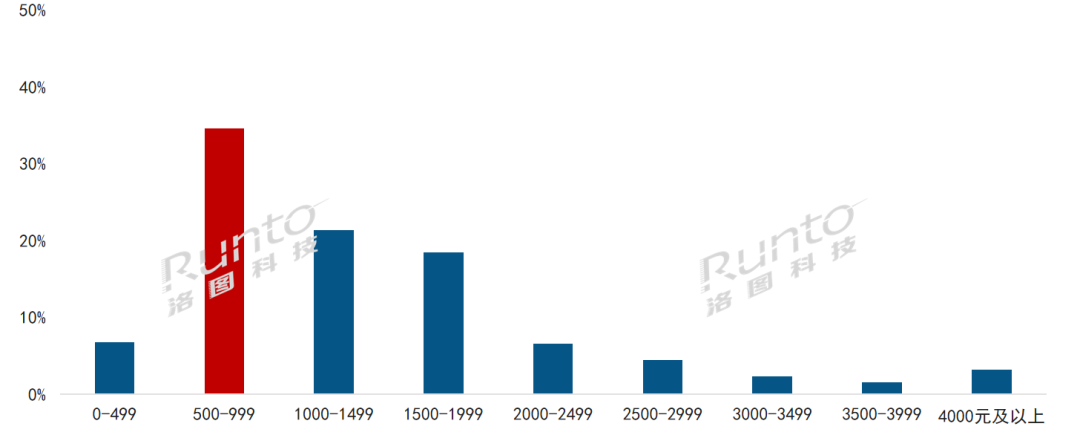 市場主銷價格方面,2000元以下的產品占據了整個市場近82%的銷量,其中500-999元價格段的產品銷量占比35%,而1000-1499元價格段占比21.5%,1500-1999元價格段占據18.5%。