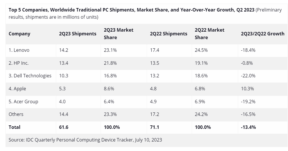 IDC 表示整體需求疲軟導致所有 PC 廠商都維持在“清庫存”影響,除蘋果和惠普公司外,所有領先公司在本季度都經歷了兩位數的下滑。