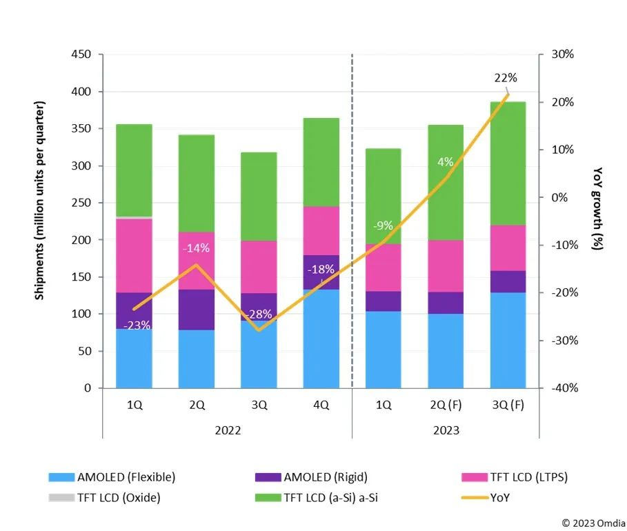 Omdia出具的出貨量數據顯示,2023年第二季度的智能手機顯示面板總出貨量預計將達到3.542億片,同比2022年第二季度上升4%。出貨量預計將在2023年第三季度達到3.856億片,同比2022年第三季度上升22%。