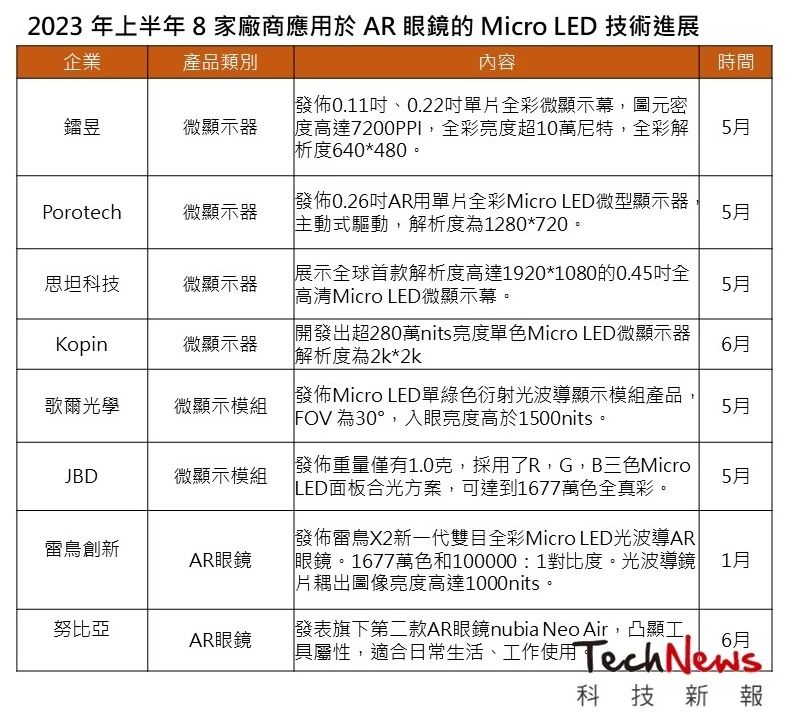 統(tǒng)計2023 年光是上半年有宣布關(guān)于Micro LED 微型顯示產(chǎn)品技術(shù)開發(fā)進(jìn)展的企業(yè)就包含了鐳昱、Porotech、思坦科技、Kopin、歌爾光學(xué)、JBD 等6 家廠商,推出搭載Micro LED 顯示面板的AR 眼鏡廠商則有雷鳥創(chuàng)新與努比亞2 家。