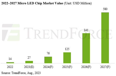 根據(jù)TrendForce集邦咨詢的預(yù)估,2023年Micro LED芯片的產(chǎn)值會達(dá)到2,700萬美元,年成長92%。放眼未來,在現(xiàn)有應(yīng)用出貨規(guī)模放大與新應(yīng)用陸續(xù)加入的刺激下,2027年的芯片產(chǎn)值預(yù)估將達(dá)到5.8億美元,自2022年到2027年的年復(fù)合成長率達(dá)到136%。