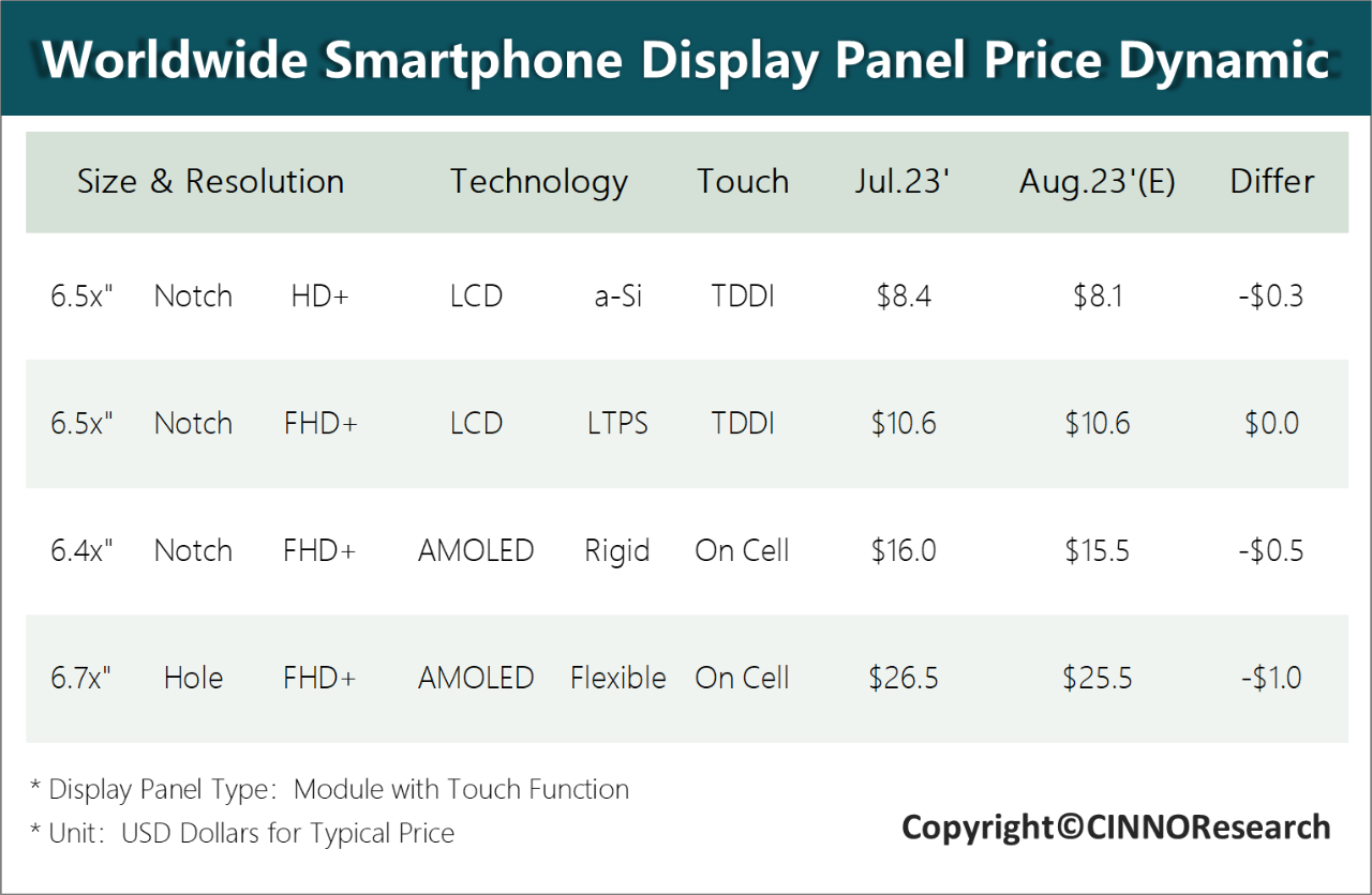 AMOLED方面:在旺季效應(yīng)的帶動(dòng)下,面板需求持續(xù)增加,剛性及柔性AMOLED面板價(jià)格降幅均有所收斂,尤其柔性AMOLED面板,在經(jīng)歷了數(shù)月的降價(jià)后將在Q3’23趨于平穩(wěn),部分面板廠亦在尋求漲價(jià);