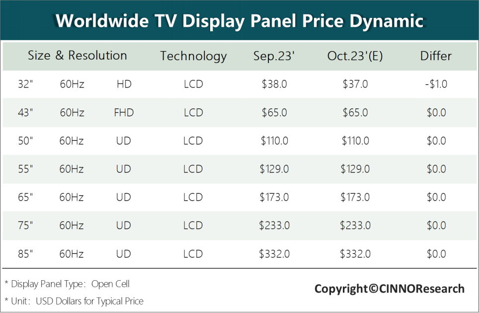 CINNO Research預計,10月32”~85”各主要尺寸面板價格,大體上將繼續維持9月的趨勢,但由于供需進一步轉向買方市場,85”價格也將停止上漲,43”~85”的絕大多數主要尺寸面板價格均將維持高位橫盤,而32”需求尤為不樂觀,且渠道尚有不少庫存,供給偏松的情況下,預計10月較9月價格下跌1美元,降至37美元,具體表現為或在部分二線市場率先跌價。