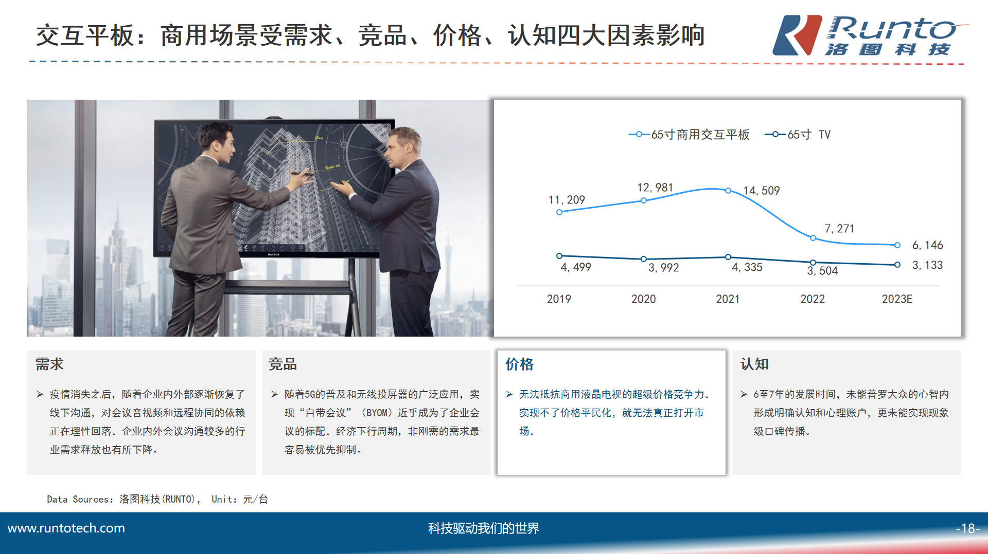 其中教育市場預測下降13.9%,商用市場預計下降28.4%。教育市場主要因需求釋放的速度緩慢;而商用市場則受需求、競品、價格、認知四大因素的共同影響。
