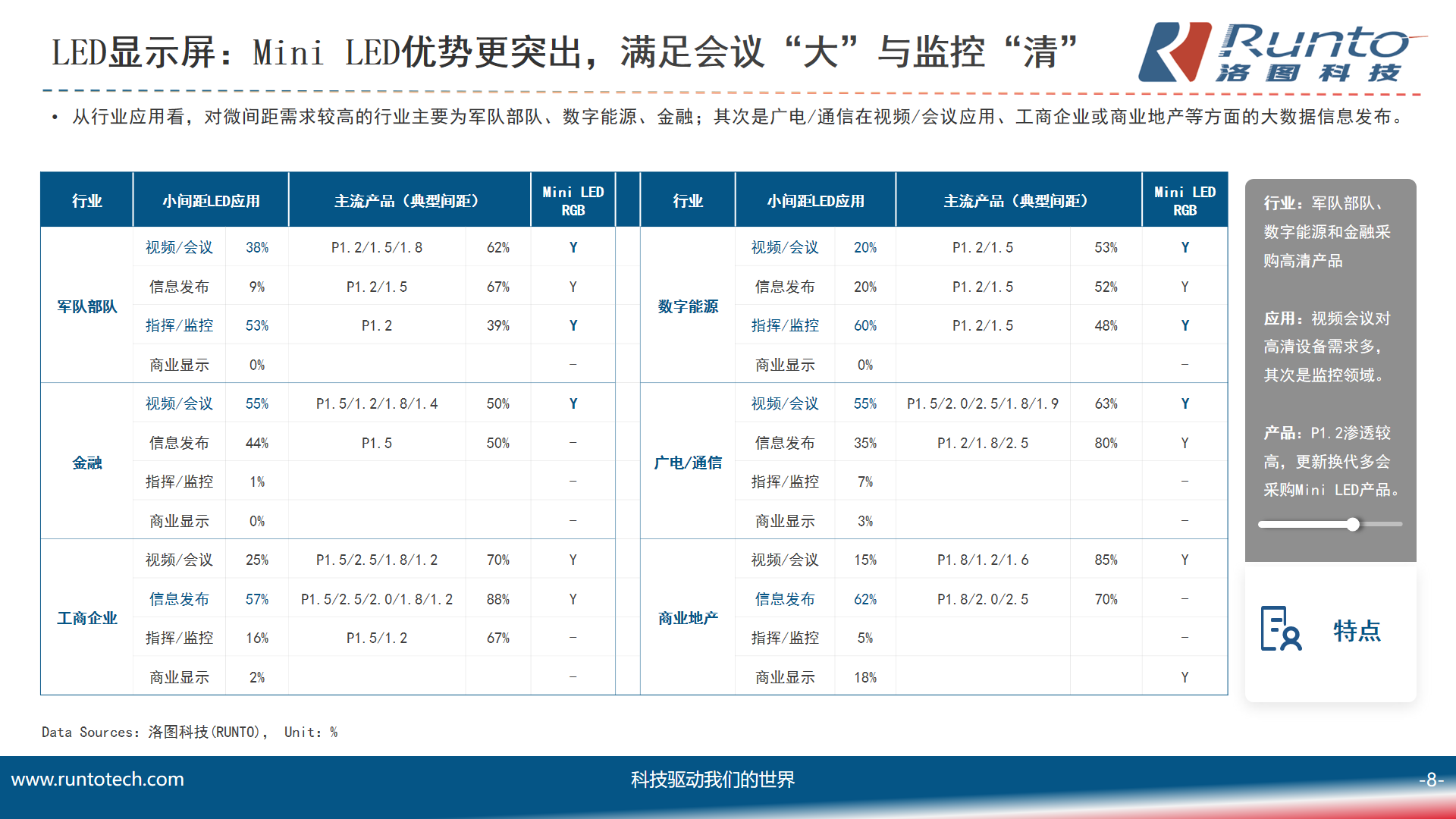 --微間距應用行業:Mini LED優勢更突出,滿足會議“大”與監控“清”。從行業應用看,對微間距需求較高的行業主要為軍隊部隊、數字能源、金融;其次是廣電/通信等。