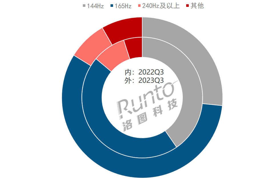 2023年第三季度,電競市場的刷新率結構呈現穩步升級趨勢,165Hz的主體地位也進一步得到了彰顯。根據洛圖科技(RUNTO)線上監測數據顯示,165Hz(含170Hz超頻)的電競市場份額約為57%,同比增長了11個百分點。