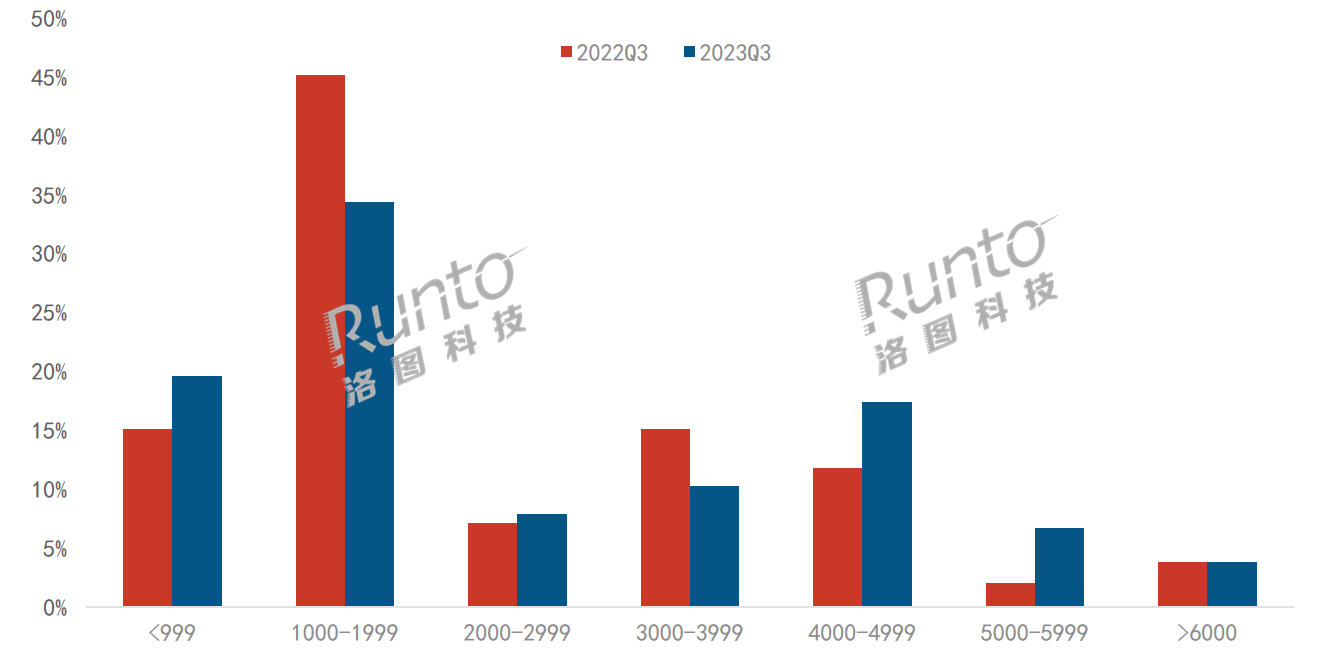 2023年第三季度,學習平板線上市場的最主銷價格段為1000-2000元,占比為34.4%,比去年同期下降了16.7個百分點。