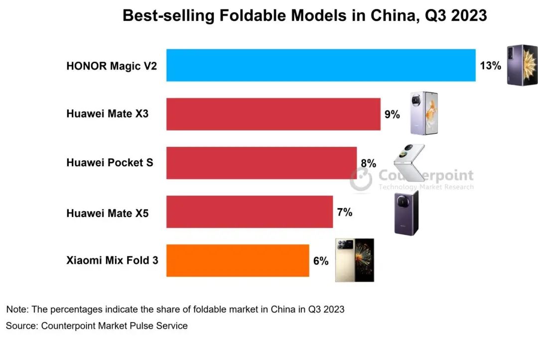 不過(guò),盡管人們對(duì)折疊屏非常感興趣,但折疊屏手的耐用性、價(jià)格、折痕的突出和屏幕折疊時(shí)設(shè)備的笨重性依然被人們廣泛提及,并表示擔(dān)憂。其中,23% 的受訪者表示當(dāng)前折疊屏手機(jī)的最大痛點(diǎn)是耐用性。折疊屏手機(jī)一旦出現(xiàn)損壞,維修成本非常高昂,因此在質(zhì)量和售后服務(wù)方面的聲譽(yù)成為品牌選擇的首要因素。此外,大多數(shù)受訪者認(rèn)為折疊屏手機(jī)折疊時(shí)厚度不應(yīng)超過(guò)10至12毫米,并且能接受價(jià)格在7,000-8,000元人民幣之間。目前,中國(guó)可折疊智能手機(jī)市場(chǎng)今年呈現(xiàn)指數(shù)級(jí)增長(zhǎng),第三季度同比增長(zhǎng)106%,其中華為占比為34%,是折疊屏機(jī)型中最受歡迎的品牌,榮耀Magic V2銷量最好,是本季度最暢銷的機(jī)型。