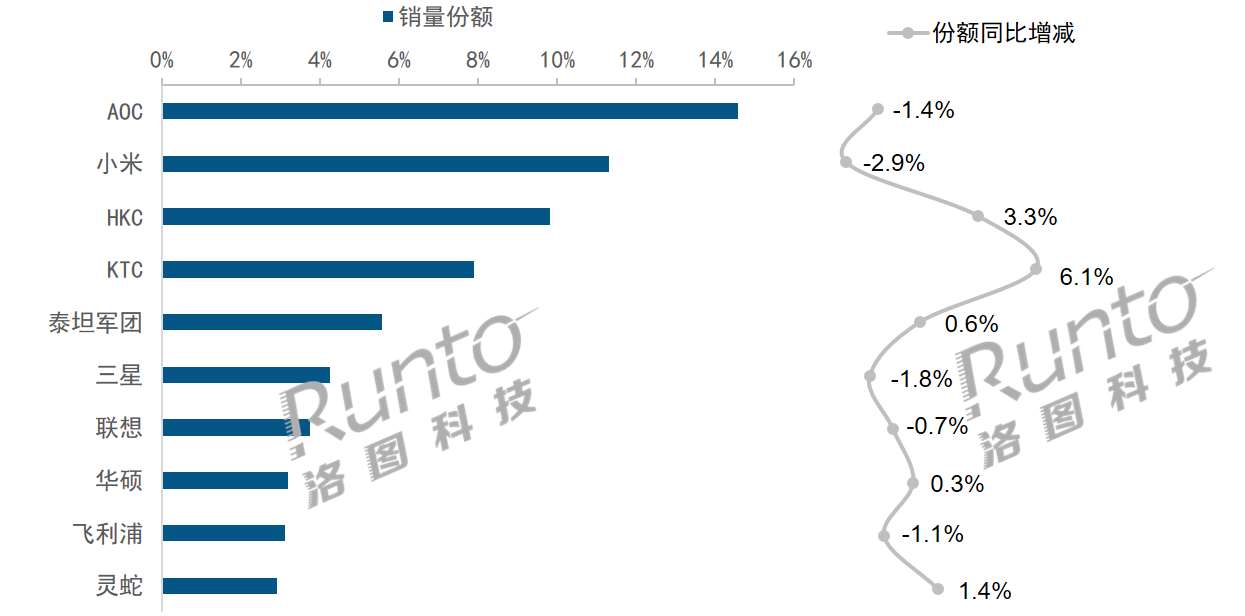 AOC依然保持銷量榜首的地位,與小米一起聯手成為僅有的銷量突破10萬臺的品牌,但銷量同比下降不少,市場份額分別下降了1到3個百分點。