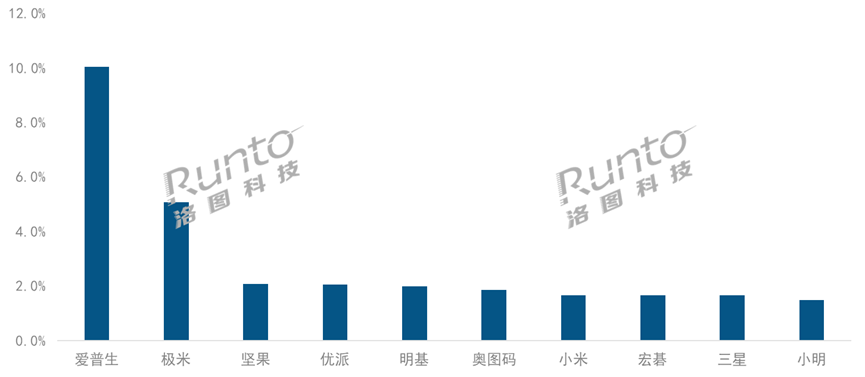 前二名品牌的市場位置相對穩定,且與第三名之后的品牌拉開了較大差距。而在第三至十名的品牌,相互差距并不大,銷量份額分布在1.5%-2.5%之間,排名在每個季度略有波動。