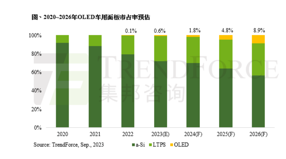TrendForce集邦咨詢最新「車用顯示面板市場發展分析報告」顯示,隨著汽車市場的逐步復蘇加上智能座艙的推廣下,整體汽車顯示面板的需求逐漸回穩,并開始有上升趨勢,預估2023年車用顯示面板整體供應量將保持增長,2026年預計供應量將超過2.4億片。而伴隨OLED面板的效能提升及成本持續優化,OLED車用面板市占率至2026有望達8.9%。