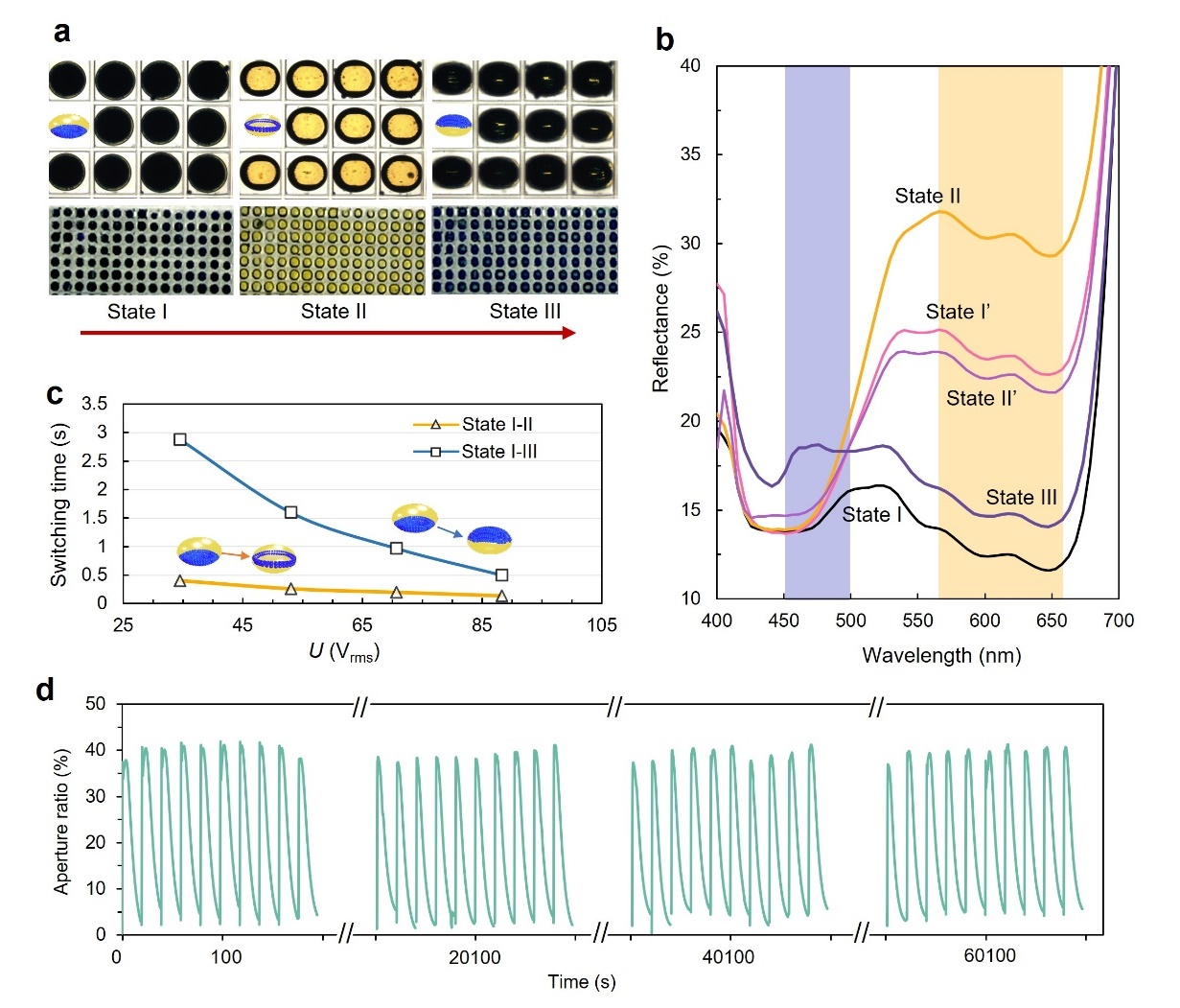 盡管針對液滴中電場驅(qū)動粒子組裝已經(jīng)有了不少研究。但是在本次工作之中,他們首次將液滴“壓扁”,這不但增加了液滴與驅(qū)動電極的接觸面積,而且可以調(diào)控電場的分布。另外,他們還發(fā)明了一種基于液滴電融合的液滴陣列化方法,實現(xiàn)了簡單、可靠的大面積液滴生成與陣列化技術,有效提升了器件制備和封裝的可靠性。為了進一步實現(xiàn) eMAPD 的實用性,他們還優(yōu)化了多種彩色顯示油墨,證明了 eMAPD 的多彩色顯示能力,發(fā)現(xiàn)其具有快速刷新、廣視角和雙穩(wěn)態(tài)等特性,能為節(jié)能綠色顯示技術的發(fā)展奠定基礎。目前,課題組正在打造基于粒子組織結(jié)構的開關,這是一種光的閥門,它的開關性能可以被電場控制,而且具備易于集成的特點,有望用于集成光調(diào)控器件之中。