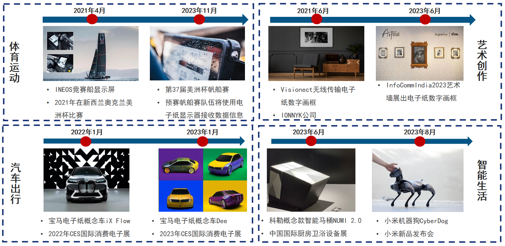 在全球模組產能最集中的中國市場,一系列的有關政策于2023年出臺。8月,工信部等八部門印發《建材行業穩增長工作方案》提出聚焦新型顯示、航空航天、生物醫藥、環境治理、新能源等領域需求,加快新材料產業發展應用。9月,工信部、財政部印發《電子信息制造業2023-2024年穩增長行動方案》,提出在新型顯示方面,面向新型智能終端、文化、旅游、景觀、商顯等領域,推動AMOLED、Micro-LED、3D顯示、激光顯示等擴大應用,支持液晶面板、電子紙等加快無紙化替代應用。2024年1月,工信部、教育部、科技部等七部門聯合印發《關于推動未來產業創新發展的實施意見》,提出要加快新型顯示在智能終端、智能網聯汽車、遠程連接、文化內容呈現等場景中推廣。這些利好政策在不同程度上都將促進電子紙產業在中國的的發展。