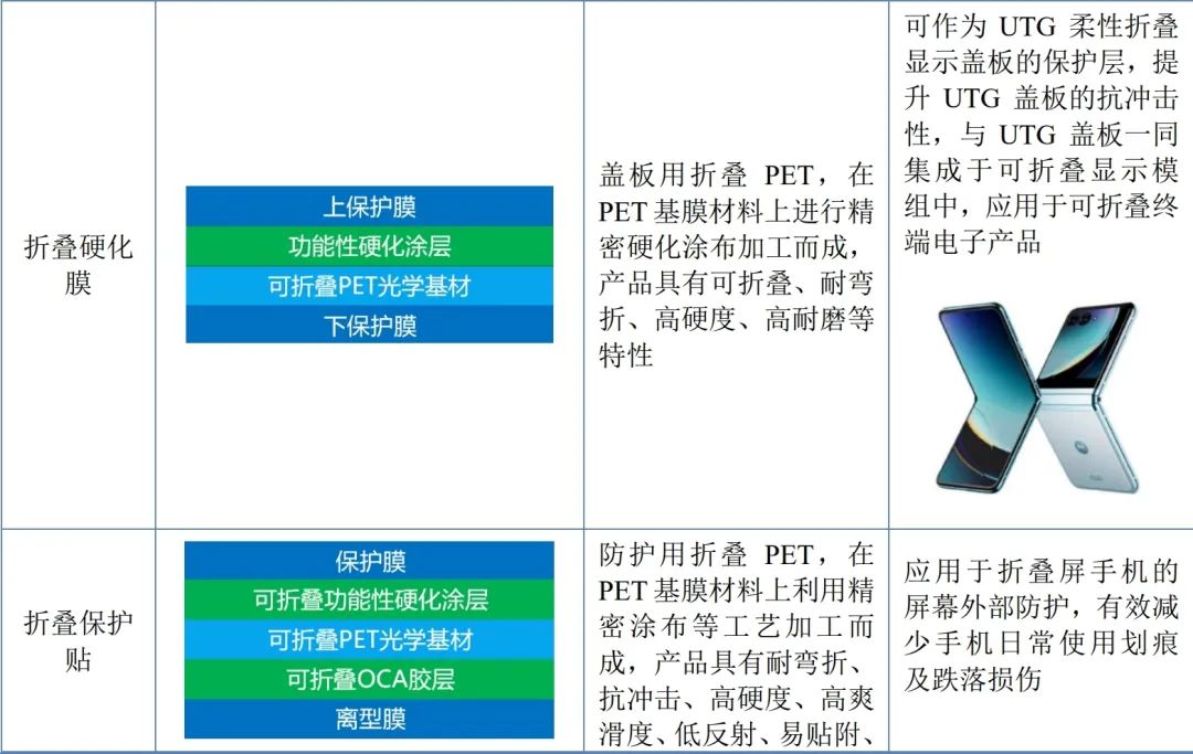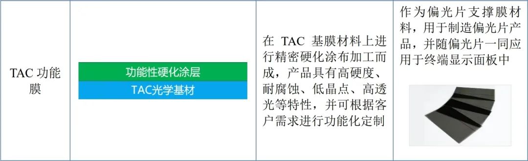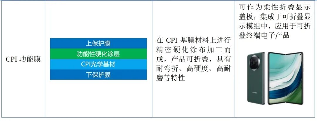 公司致力于實現高端光學膜材料的國產替代,綜合運用電子產品屏幕防護材料設計及制造技術、精密涂布工藝等核心技術,對CPI、TAC、PET等基膜材料進行加工及復合生產,提升膜材料物理屬性,改善膜材料光學性能,使膜材料具備可折疊、耐腐蝕、防眩光、抗刮擦、防爆裂、防指紋等功能,是目前國內少數可實現 CPI、TAC功能性膜材料生產的企業之一。