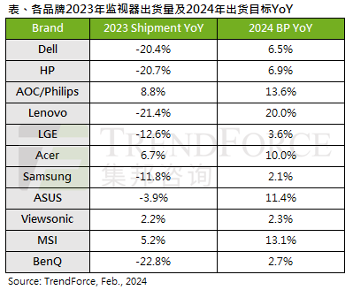 TrendForce表示,2024年商務及消費級顯示器品牌出貨目標偏保守,其中聯想最為積極,目標增長20%;AOC/飛利浦、微星、華碩以及宏碁,年出貨增長目標均超過10%。三星、LG、明基則制定了比較保守的出貨目標,重心將放在獲利及高端產品線。