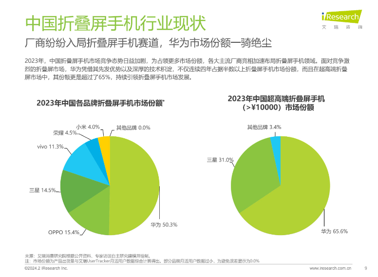 近日,艾瑞咨詢發(fā)布《2024年中國(guó)折疊屏手機(jī)市場(chǎng)洞察報(bào)告》(以下簡(jiǎn)稱(chēng)《報(bào)告》)。《報(bào)告》顯示,華為2023年國(guó)內(nèi)折疊屏市場(chǎng)占比50.3%,連續(xù)四年占據(jù)半數(shù)以上折疊屏手機(jī)市場(chǎng)份額,而且在超高端折疊屏市場(chǎng)中,其份額更是超過(guò)了65%。