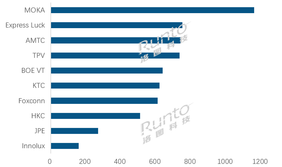 --HKC(惠科)當月出貨超過50萬臺,排名專業(yè)代工廠第八,同比亦大幅增長超過60%,環(huán)比基本持平。