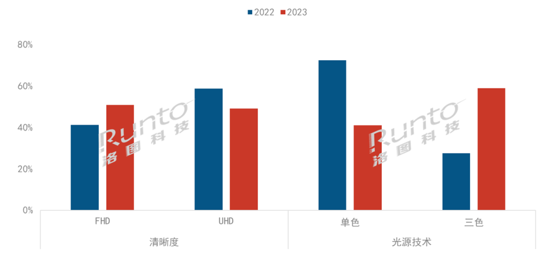分辨率方面,FHD產品在家用激光投影市場的份額達到51%,同比增長10個百分點;UHD市場份額下降10個百分點,達到49%。