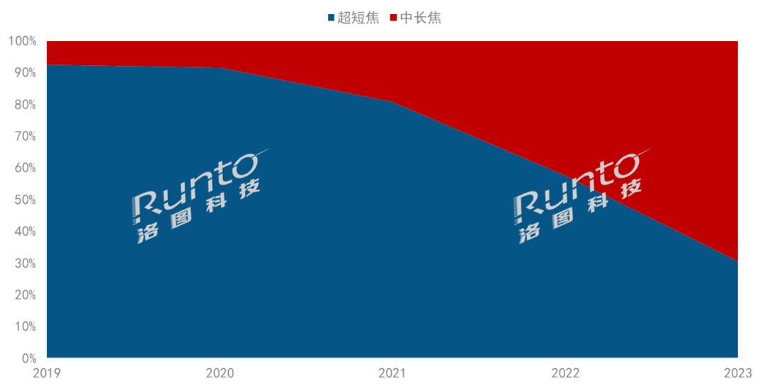 從鏡頭技術看,中長焦和超短焦在2023年首次出現反轉。根據洛圖科技(RUNTO)數據顯示,2023年,中長焦激光投影全年出貨量為41萬臺,同比增長121%;其與超短焦技術的出貨量比例從2022年的42:58變為2023年的69:31。