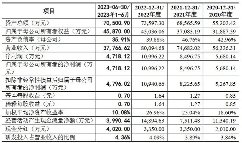 財務方面,晶訊光電于2020年、2021年、2022年以及2023年1-6月營業收入分別約為5.63億元、7.47億元、8.01億元、3.78億元,同期,凈利潤分別約為5680.14萬元、8496.75萬元、1.10億元、4718.12萬元。
