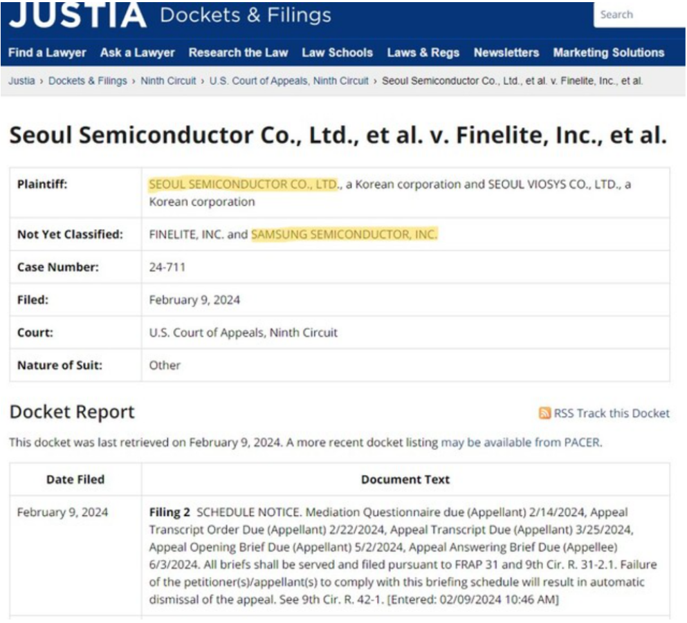 2月26日,美國加州北區上訴法院正在就首爾半導體及其子公司首爾偉傲世、法國FINELITE公司、韓國三星半導體于2022年5月13日提起的專利侵權訴訟進行上訴聽證會。